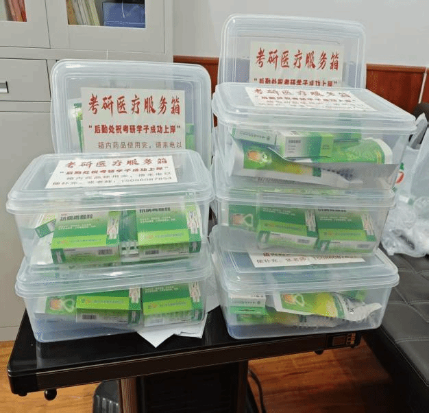 在医疗保障方面,后勤处立足备考学子高强度学习下的健康需求,精准统筹物资调配,实现考研自习室医疗保障全覆盖。针对 1-11 栋(含 F5 栋)学生宿舍、顺理楼、美术设计楼、乐学楼等学子集中备考的重点楼宇,精准投放 23 个考研专属医疗服务箱,箱内配齐感冒药、退烧药、止痛药、创可贴、消毒湿巾、体温计等常用药品及应急防护物资,为学子们的身体健康筑起 “移动防护墙”,让大家在备考途中无健康后顾之忧。