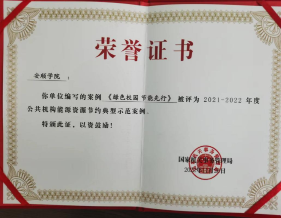 按照《公共机构能源资源节约示范案例编制推广实施细则》的要求,国家机关事务管理局和贵州省机关事务管理局组织开展了2021-2022年度公共机构能源资源节约示范案例遴选工作。经多轮专业评审、公示,我校编写的《绿色校园 节能先行》案例荣获全国“2021-2022年度公共机构能源资源节约典型示范案例”称号以及省级示范案例二等奖,国家同省级机关事务管理局分别为我校颁发荣誉证书。