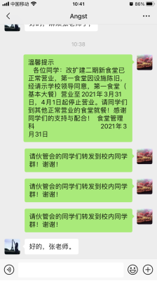 2、安排伙管会学生转发“一食堂4月1日起停业”的温馨提示。